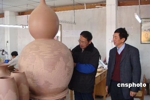 1月3日,由广西钦州市钦宝斋坭兴陶艺有限责任公司生产的中国最大的坭兴陶葫芦——八仙过海葫芦将于近日出炉,该葫芦高1.5米、直径0.67米、重55公斤,成品的八仙过海葫芦价值10余万元。图为工艺美术大师为八仙过海葫芦坭坯刻字。中新社发 杨志雄 摄