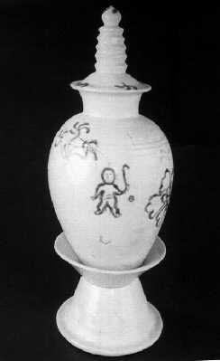 出土的两件唐代青花塔形罐在同一墓室中,形状相同,由盖、罐、底座三部分组成,白瓷胎。器盖呈塔刹状,刹座为一覆碟刹身。一罐身饰“童子打曲棍球”、牡丹图案,另一罐上则饰有万字符等纹样。罐身所绘“曲棍球”图案引人注目,图案中的人物叉腿而立,右腿微曲,左手扬弯形球杆,左侧有一圆球,形象生动。