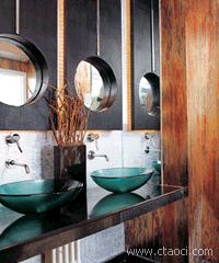 整体风格:因为卫生间本身不大,所以这套卫生间的墙面采用了高反光的玻璃材质,地面也用了高抛光的瓷砖,配合以明亮的灯光,卫生间看起来大了不少。不锈钢的面盆、龙头、透明的淋浴间使整个卫生间极富现代感。