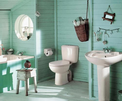 满眼的湖绿色,如一泓春水,在阳光的照耀下熠熠生辉。乳白色的洁具、古朴自然的田园风格浴室家具、一两件藤木小物件,再没有比这儿更闲适的地方了。