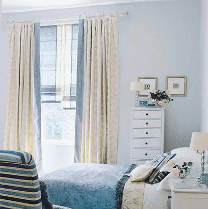 若觉得整幅窗帘单一呆板,可在同一扇窗户上分别采用紧贴窗体的提拉式浅色外帘和对开式内帘搭配悬挂,即可达到多层次多线条的视觉效果。