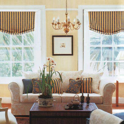 对于竖长造型的不落地窗型,根据窗户的内轮廓量身定做一套罗马帘,简洁的造型及悬挂方式让窗帘与窗户紧密结合,严丝合缝。