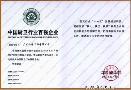 继“政府强制采购节能产品”荣誉,恒洁卫浴捷报再传。由中国建筑装饰协会主办的、以企业的综合实力、市场影响力作为评价依据,评定恒洁卫浴与欧派橱柜、方太厨具、科勒卫浴、TOTO、惠达陶瓷等企业同步评为07年度《中国厨卫行业百强企业》。此殊荣,充分肯定恒洁卫浴这面民族品牌旗帜的不断努力,极大的鼓舞恒洁人的士气。相信在国家贯彻“扶大、扶优、扶强”的战略指导下,恒洁仍会一路领跑。