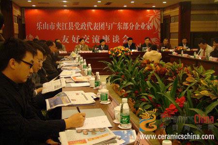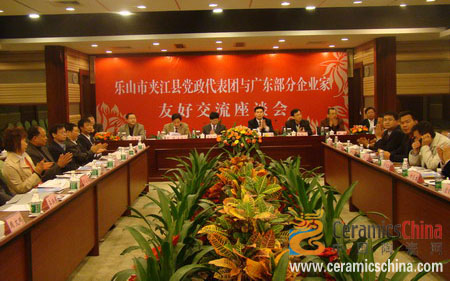(本网讯 主编 苏振明 特约记者 洪秀明 摄影报道)1月6日下午,由乐山市和夹江县政府领导班子组成的招商考察代表团,在佛山华夏新中源大酒店举行市情介绍和招商洽谈会议,佛山市陶瓷行业的陶瓷、机械、化工、马赛克等产业的数十家企业代表应邀出席了会议。
