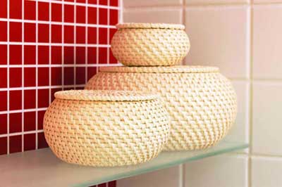 编织式收纳罐,大有大的用途,小有小的道理。或者全部摆出来,勾勒幅“吉祥三宝”的景象,让爸爸、妈妈和孩子都收纳有道。而且罐盖能有效避尘,还具私密性,避免了来客用卫浴间的不方便。手工编制,民俗特色,与卫浴间的现代风格形成对比,是现今流行的混搭派。