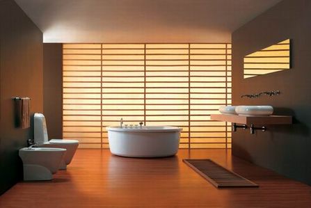 奢华空间 圆形的台盆和浴缸给人以奢华的感觉,木质的踏板和移门设计,给人以浓重的怀旧感。