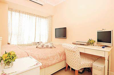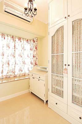 粉橙色布置可营造梦幻般的童话气氛,教人顿时眼前一亮,营造“家”的感觉。客、饭厅堂分界鲜明,墙身上半部配用粉橙色,甚为夺目,下半则以条纹式设计,为平实的墙身增添动感一面。客厅摆放了鲜红色布艺沙发,与一室散发的田园风格甚为匹配。旁边的落地玻璃配用半透视的碎花窗纱,可阻隔过量的日光内进,又可为室内空间添上乡村风味。细心一看,原来电视组合柜亦见心思,印上不少拼花图案,为简洁的柜子带来生气,轻易地点缀一室的视觉效果。维多利亚风格饭厅布置精致,中央放了四人餐桌和碎花餐椅,为增添储物量,已分别设计出同系列的饰柜及地柜,设计略带维多利亚色彩,为单位塑造优雅一面,亦营造了理想的进膳环境。主人房贯用同一色系的家具,加设特色睡床背板,糅合房内各式碎花图案,让房间恍如精品式小寝室,并放下小植物,为居者带来好心情。另一方面,是一入墙躺式衣柜,以半透玻璃作配,内藏间隔甚多,足以容纳不少衣物。另一个房间则改为书房,淡淡的绿色设计,感觉清新写意,以深黑色吊灯作配。