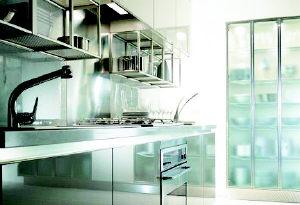 标准长度可折叠的玻璃门,采用宽阔的磨砂玻璃,柜内餐具、器皿、厨具若隐若现。生动的背景光投射下,玻璃橱柜使整个厨房营造出一种温馨浪漫的氛围。美观大方的玻璃橱门,有着不容小觑的实用性,通风透气,寻找东西也十分方便,不会因为要找一样东西,翻箱倒柜;橱柜内置轻巧的触摸式感应灯,白天日光和夜晚灯光的反射,能使厨房更明亮。玻璃橱柜清淡的色泽,配合时柔和、时耀眼的光亮,化解了银灰色金属质感厨具、橱柜的枯燥乏味,顷刻之间,就把厨房变得平和而有趣。