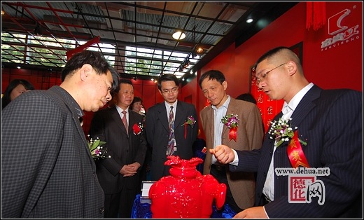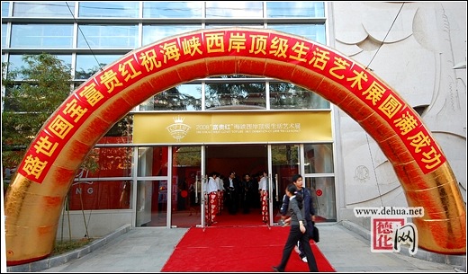 【德化网 讯】价值1.8亿的根雕、标价7000多万的神六飞天图、价值850万的刺绣、价值120万的奔驰车、价值200多万的紫砂壶、国宝级的德化富贵红陶瓷、武夷山顶级名茶大红袍、寿山石极品田黄、甚至游艇、直升飞机(非实物)……各种标价令人咋舌的顶级“奢侈品”随处可见,这是记者12日在厦门2008“富贵红”海峡西岸顶级生活艺术展看到的一幕。