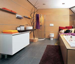 传统的卫生间只是机械地把浴缸、龙头、洗脸盆组合在一起,其实人们真正需要的不是龙头、浴缸本身,而是需要从中流出的水,它们只是一个载体,提供了一个与水共生的放松环境。把来自于大自然的曲线、协调的形态引入卫浴空间,带来返璞归真的风格,体现人与自然的紧密结合,是当今卫浴设计的趋势。想像一下:白色洁具,让你犹如回到了大自然的怀抱,喧闹繁杂的都市背景下,秋风送爽的美丽夜色里,有什么比在小小空间里让大自然的气息拥吻,回味年少纯真的梦想更美妙的事?