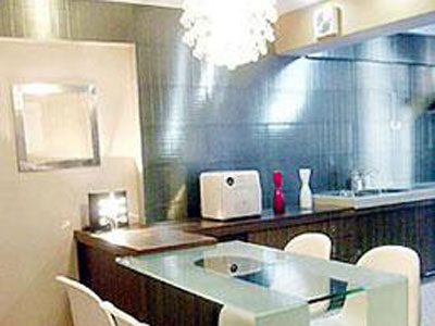 餐桌椅在开放式厨房间的摆放,必须注意要留出烹饪操作空间,当餐椅拉出餐桌时,其椅背距橱柜要在一米以上,而一般的餐桌椅?砸惶ㄋ囊挝例?辽僖占2米的宽度,再加上橱柜的进深,就要求开放式厨房的长或宽一边至少要在3.6米以上。
