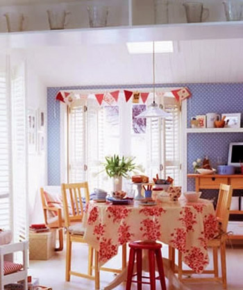 鲜明的白色、红色和蓝色将餐厅空间装点得明净、通透而又轻松写意。新英格兰风格的百叶窗门、圆点花样的蓝色壁纸和精制的白、红色织物, 让人轻易便欢快轻松起来,那一排孩童的卡片更是让家庭的温暖瞬时散发出来,令人陶醉。
