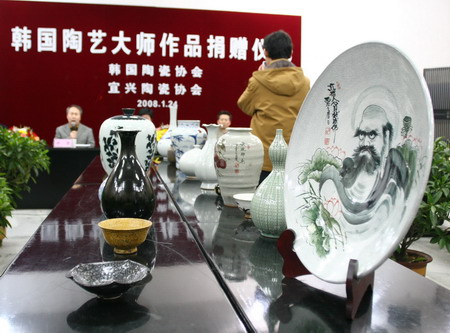 1月24日,韩国陶瓷协会向江苏省宜兴市赠送了21件由韩国著名陶艺家创作的陶艺作品,这些作品由宜兴陶瓷协会收藏,并将设专柜展出。新华社发(丁焕新 摄) &$ 点击更多精彩好图