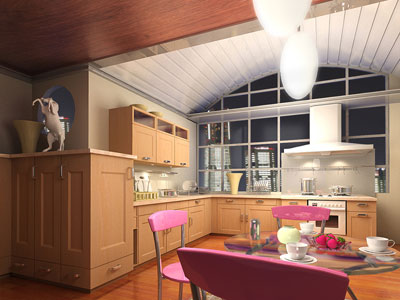 朦胧灯光烘托温馨氛围:厨房的位置一般都不是家里采光最好的地方,因此厨房里灯的安装就显得极为重要。因为橱柜的组合比较复杂,只有顶灯是远远不够的。应适当的安装一些组合灯,以调节局部光线。像准备区最好专门有一组灯光,既可减轻眼睛的疲劳度,也方便操作。如果想在厨房看书的话,就要放置一盏落地灯,可以营造一些温馨的氛围。
