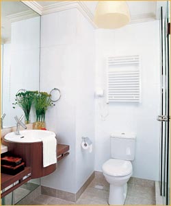 与淋浴间相对的墙面完全使用了镜子,扩大了小浴室的空间视觉感,镜子前面做成了浴室架,上面安装了台式盆,这里可以梳洗打扮,边上的绿色植物,成了整体设计中引人注目的亮点,也为环境带来了生气。马桶理所当然地放在了正中。整体效果简单清新。