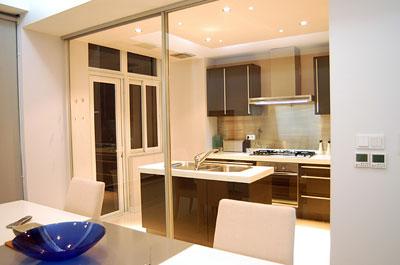 建议一:空间改造要巧 每个厨房空间在建筑时均会有防火墙或过顶梁等基本结构,对厨房隔墙改造时,一定要考虑结构的现有情况,做到“因势利导,巧妙利用”。如要改造的墙体上有过梁,可以保留此过梁,将它改造成“开放式厨房”的吧台灯光顶,而不能将它拆除,以免影响到建筑结构的稳定性。