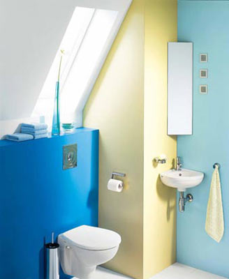 开阔型斜屋顶:空间足够大,完全可以让人站立活动,可以选择挂墙式坐便器,墙面上可以设计一些收纳格,用来存放卫浴用品,增加了其空间的利用率。