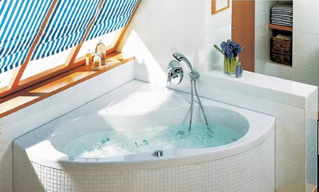 如果卫浴间是全落地式斜屋顶或者是斜屋顶下方特别低,这时候可以选择适合角度的三角形浴缸。这样就避免了倾斜的角度,大大提高了其舒适性。