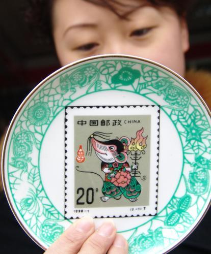 2008年1月25日,江西省景德镇集邮公司,营业员展示生肖鼠邮票艺术瓷盘。