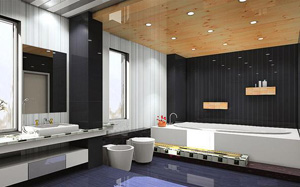 大户型卫生间可以有很大的空间来进行设计,超大浴缸,木制吊顶,三排内嵌式射灯,高档马桶和洗漱台,一个有意设计出来的一级台阶将大户型卫生间内的浴缸与洗漱台分成两个,营造出高雅的情调。