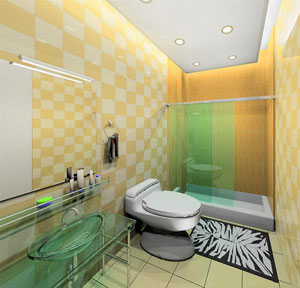 玻璃卫浴设计尽可能多的使用玻璃作为浴室构件或浴具的材质,打造出通透的感觉,一般多使用于小空间的卫浴设计,因为玻璃的透明性使人在视觉上产生了空间的错觉,从而有改变空间大小的作用。