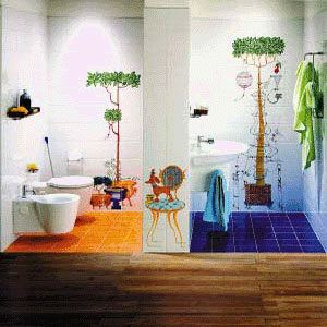 在卫浴空间墙面瓷砖的选择上,可以选择一些卡通效果等等。对于价格昂贵的,买一两块来装饰一下就可以,比如一条装饰线同样可以起到画龙点睛的作用。昆虫,油画,动画人物都可以。而且可以发挥你的想象,自由发挥,将它们任意组合搭配。