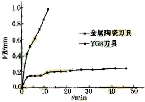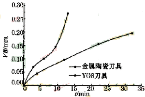 图2 金属陶瓷刀具和YG8刀具切削冷硬铸铁时的磨损曲线