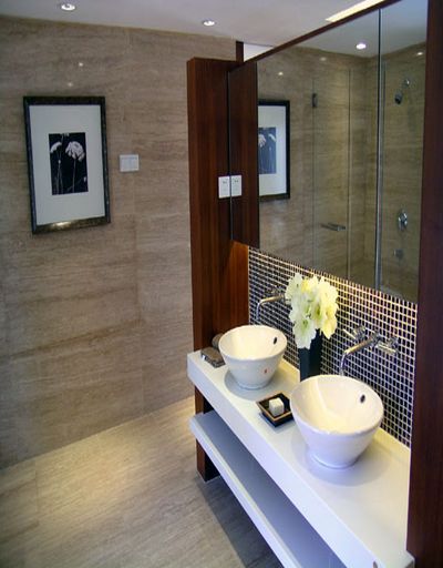 比如这套小复式中上下两层都有洗手间,设计师便提出了“一主一辅”的方案,一楼的卫浴间供客人使用,于是只装了一个座便器、一个台盆和一个花洒,并简单地用浴帘将卫浴间间隔开来。