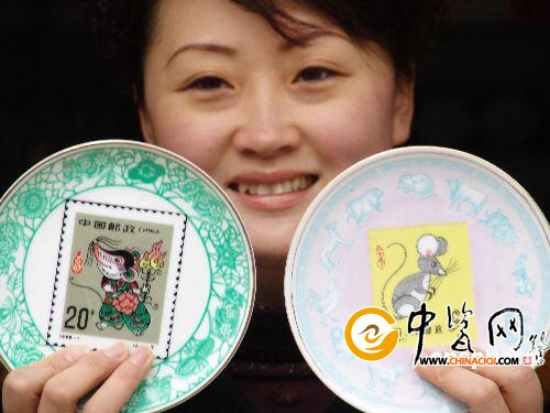 1月下旬,江西景德镇集邮公司展示的邮票艺术瓷盘。据悉,该盘是一种将邮票艺术与陶瓷艺术融为一体的集邮收藏品。