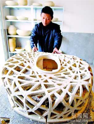 景德镇新都陶瓷园的工作者昨天在制作陶瓷“鸟巢”坯子。江西景德镇新都陶瓷园的工作者将烧制中小型陶瓷“鸟巢”,几种陶瓷“鸟巢”的直径分别为72厘米、36厘米和25厘米。
