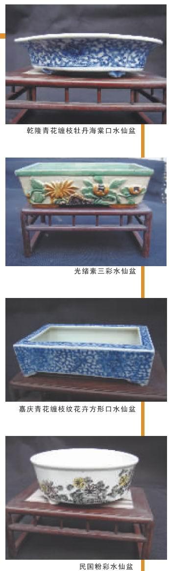 明清时期,水仙盆的造型更为丰富。胡桂标向我们展示的水仙盆包括清乾隆、清嘉庆、清光绪以及民国时期的制品,其口形多样,除了圆形、方形等,还有造型别致的海棠式口,器口椭圆,呈四瓣花口,优美异常。