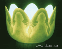 此注子为小口长流,高24.5厘米、腹径12.5厘米、口径3.5厘米、足径6厘米,壶柄弯曲带式,壶盖直颈、盖顶有一尊卧式坐狮;壶体为六瓣瓜棱形,圈足外撇。注碗为花口,高13.5厘米、口径15厘米、足径10厘米,造型似一株莲花包蕾,花瓣为七出;花瓣间刻划归着蝶形如意纹饰,碗的圈足外墙刻划一圈椭圆状花纹。在莲瓣的顶部外侧凹刻出复瓣莲纹,在灯光的映照下可见入刀和中途转换方向的位置与力度。有趣的是在每片莲瓣的主体位置,在灯光映照下,像一个个虔诚的佛家弟子“打坐”相。
