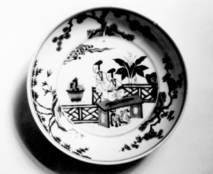 端详盘面,映入眼帘的主题画面,是瓷绘师所作的“二乔”。“二乔”的容貌,恰如耿宝昌先生所云的:“发髻高耸,脸庞丰满,眉似弯月,唇似朱点”,如此貌美娇媚的容颜,完全是一派国色天香的大家闺秀。细看衣着,细细的数根柔美青花线条,勾勒出绸料的轻盈,华贵而飘逸;巧妙地利用一小点一小点的青花,描绘成团花,显示了穿著的华服淡雅而秀丽。眉清目秀的“二乔”,同时侧着脸注视着庭园的前方。她俩,引颈前探,仿佛在期盼着什么?又仿佛听到了什么,真在凝神细观……是否,由于放置在长桌中央的古琴,弹奏出的悲凉的乐曲,唤来了空谷知音,更希望逃逸出这阴森可怕的樊笼?