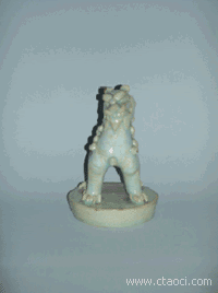 北宋中晚期至南宋,景德镇附近的湖田等窑场,将影青瓷制作工艺推向历史巅峰。湖田窑影青兽镇的工艺特色,标志着当时陶瓷雕塑制作工艺已达到炉火纯青的境地。兽镇高14.2厘米,圆形底座上塑昂首傲立之猛兽,龙首狮身,似猊似虬。怪兽四足踞地,五趾锐利,竖耳拭眦,纵目扬眉,咧嘴啮牙,相貌可畏。头颈镂刻鬈鬃虬髯,背、腿部刻、划画短茸顺髦,颈前簇点梅花斑点,缀铃铛三枚。造型夸张生动,刀法犀利,手艺娴熟。瓷胎细白坚致,釉质湖绿洁莹,胎釉结合紧密,瓷化程度完全达到近现代瓷的标准。