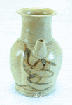 的彩釉虽有削落之处,但这非但没有损害其整体形象,相反增加了器物厚重的沧桑感,使人一看便能认定这是开门的长沙窑。长沙窑釉下壶类产品,其纹饰都在流的正下方,该壶纹饰以褐彩勾线,绿彩晕染,其奋飞的鸿雁及其一抹青山,虽极简练,却引人入胜,浮想联翩。你看那刚健壮硕的大雁,引颈昂首,喙部与壶颈相接,雁首直指天穹,双翅舒展,作飞行鼓动状,仿佛使人听到它搏击空气的呼呼风声,雁翎以褐彩勾勒,根根硬朗明快,齐刷刷的向后,更增加了迎风前进的动态感。在雁纹的下方接近壶身底脚处,画师匠心独运,巧妙地绘有两座青绿山峰,着笔不多,却意境深远。