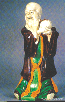 自有寿星崇拜以来,其形象有一个逐渐演变发展的过程,到清代已基本定型。河北省博物馆藏有一件清康熙年间的素三彩“寿星捧桃瓷像”,就是一位天庭饱满、鹤发童颜的古装老者,手捧鲜桃,含笑而立,那慈祥和蔼的面容,令人感觉可亲可敬……由此可见,银发长须、头高额隆、大耳短躯、面目慈祥——凡此种种形象特点,于寿星而言是缺一不可的。素三彩,是一种极为珍贵的釉上彩瓷器品种。这种工艺始创于明成化年间,到清康熙时已日臻成熟。这个时期景德镇的素三彩瓷器极负盛名,是素三彩制品最为精致的时代。素三彩常见的颜色有黄、绿、紫,其制作方法是在高温烧成的素胎上用彩釉填在已刻划好的纹样内,再经低温烧成,因颜色中没有红色等鲜艳色彩,显得素净、淡雅,故名“素三彩”。当然,“三”在文言中有“多”的含义,所以素三彩并不限于黄、绿、紫两种颜色,譬如这件“寿星捧桃瓷像”中,寿星的内衣为绿色,飘带为黄色,外衣和靴子则是施以褐色釉。在此,黄、绿、褐虽皆为素色,但釉色却很鲜艳,因此并不给人以沉闷浓重之感。