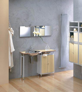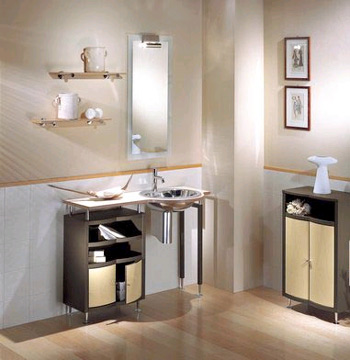 对于多数卫生间面积小的家庭而言,造型简单的浴柜既耐用又耐看,不会过时。可以根据卫生间的风格和色调选择浴室柜的颜色和材料。一般来说,如果用实木做基材,要问清是否经过防水处理,表面漆要经过高温高压处理才不易起皮、脱落。目前市场上的浴柜所用的主流基材是防水中纤板,中纤板是将经过挑选的木材原料粉碎成粉末状后,经特殊工艺加工而成的一种“钢性”板材。其强度、密度有高、中、低之分,防水性能极佳,是高档浴柜的必选之材。