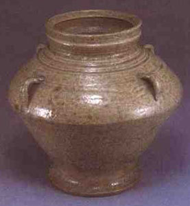 处于原始状态的青瓷制品、原始青瓷由高岭土制胎,表面施石灰釉,经过1200℃高温烧成。胎体烧结后呈灰白色或褐色、击之可发出清脆之声。早期瓷釉又称石灰水釉、是用石灰石粉碎后加适量的粘土配制而成的。以钙的氧化物为主要助熔剂,三氧化二铁为主要着色剂,在还原焰中可烧成青绿色,在氧化焰中可烧成黄绿色或灰青色。青釉透明,表面有玻璃质层。胎与釉结合紧密,不吸水或吸水率低。我国早在3000年前的商代已经出现原始青瓷,最初发现于河南郑州二里冈下层文化遗址与湖北黄陂盘龙城商代中期墓中,商代晚期河南安阳殷墟、辉县琉璃阁,山东济南大辛庄、益都,河北藁城及江西清江吴城等处也都有出土。西周时原始青瓷制作工艺有所提高,出土范围更加广阔。江南地区原始青瓷出土量及器形比北方黄河流域多且丰富。战国时期原始青瓷生产得到较大发展,无论是数量、质量还是生产范围,都是前代所不及的。从器物出土情况和窑址调查看,原始青瓷产区以长江以南为主,其中浙江的江山、绍兴和萧山地区比较集中。由于原始青瓷胎中杂质较多,故烧结后胎中气孔偏大。又由于釉料配制简单,掌握烧造技术有一定难度,因此釉色不稳定。这些缺欠决定了它的原始性,直到东汉时期、原始青瓷才发展为成熟的瓷器。原始青瓷多采用泥条盘筑法成型,器形不甚规整,胎薄厚不均匀。战国时期虽然采用轮制成型,但拍印纹饰后器物内壁凹凸不平,釉厚处呈青绿色,薄处呈灰青色。初期的主要器形有豆、碗、尊、罍、罐、盆、瓮、壶、簋、器盖等饮食器。北方由商至春秋,原始青瓷种类变化不大。江南地区在商代晚期器形种类明显增多,出现双耳簋、盂、浅盘、深圆腹圈足尊、盉等,战国时出现鼎、钟、盉、于等仿青铜礼器。江西清江吴城还出土瓷双孔刀及纺轮。器物多以素面为产,兼有水波纹、附加堆纹、叶脉纹、网纹、方格纹、蓝纹、S纹、乳纹、圆圈纹等。(见如下图)