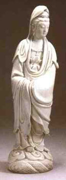 用瓷器的原料和烧制工艺做出的雕塑艺术品,也包括实用瓷器上附加的装饰雕塑。瓷塑成型有的用瓷泥捏塑,有的用范模将泥料挤压成型,近代还有用石膏范注浆成型的。瓷器发明以后,开始都是生产满足日常生活需要的实用器物,如碗、盘、杯、瓶、罐等。随着工艺的成熟,逐渐做出一些满足人们意识形态需要的雕塑艺术品和陈设品。如东汉时的瓷灯、灯座塑成人物形象,身上还爬满偷油的老鼠。三国两晋南北朝时期的青瓷谷仓罐,在一个瓷罐上塑出亭台楼阁、长廊列舍等多层建筑,上面有持械守卫的人物,有披麻戴孝作道场的送葬场面,庭园正中立看刻写年号和吉祥颂词的碑碣、周围还环绕着各种鸟兽。羊形器、牛形灯等也是以雕塑为丰的实用器具。西晋瓷塑有神兽尊、仙人骑狮、持械的部族武装、对坐的文人学士、各类动物、鸡笼狗舍模型、蛙形水孟等。隋、唐时期用雕塑手法或用陶范成型作出瓷俑,如镇墓兽、文吏武官、男仆女侍、明驼骏马、狮子,以及童于骑兽等玩具。宋、元、明、清时代的瓷塑包括瓷枕上塑出的人物、动物形象,还有童子拜观音、神仙故事、观音、达摩等。有的瓷塑还加彩饰,这些瓷塑是中国雕塑艺术的重要组成部分。在中国陶瓷史上出现许多杰出的工匠,大多数没有留下姓名。见于文献记载的有宋吉州窑的舒翁、舒娇,明末清初福建德化窑的何朝宗、张寿山、林朝景,清代景德镇的六十四等人。其中何朝宗、张寿山、林朝景等人雕塑的白瓷观音、达摩形象,亨誉海内外,被誉为东方艺术的明珠。(见下图)