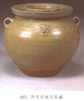 又称复口罐、双口罐,流行于东汉末至南朝时期的一种罐式,多出土于江南地区。造型为双重口,内口直,外口略低于内口且外侈,溜肩,圆腹,腹下内收,平底、与今泡菜坛形状相似。从出土情况看,西晋以前的双唇罐器身较矮,肩部饰有扁条状竖系、横向半环形四系;东晋以后,器身增高.内口直径较大,肩部亦有半环形系。(见图103)