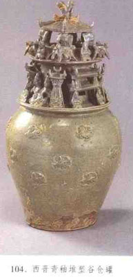 又称谷仓、丧葬罐、魂瓶,由东汉五联罐发展而来,是专为陪葬烧制的冥器,流行于三国吴、两晋时期,有陶、瓷制品。南京博物院收藏有东吴风凰二年(273年)红陶准塑人物飞鸟谷仓罐,主体为唇口式深腹罐,佛像、麒麟、朱雀、铺首衔环等纹饰贴塑于罐腹四周,口部有双阙、人物、鸟雀等,顶部有倒置直墙洗式盖。北京故宫博物院收藏的青瓷谷仓罐最有代表性,罐口部不仅有双阙、楼阁、人物、鸟兽等贴塑,罐的肩部还有伏龟驮碑,碑文有“永安三年”纪年。1978年浙江慈溪鸣鹤瓦窑头出土的西晋堆塑谷仓罐,造型虽然与上述二例相似,但罐上部的堆塑着重表现了豪门贵族生前居住的城堡式楼阁建筑,在庄园门前有歌舞伎乐俑,以及飞鸟、牲畜等。(见图104)