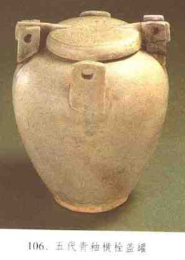 又称夹耳盖罐维、夹梁盖罐。罐式之—。1955年出土于广东番禺石码村五代南汉墓的一件、器形为直口,丰肩,以下渐收,长圆腹,圈足。肩部有两对对称的板式带孔钮座。平项盖两侧对称的位置伸出长方形带孔横栓,盖合时横栓插入钮座,与钮座的轴孔相合,可以在两孔中插销固定。或只固定—侧的轴孔,器盖能自由开合而不脱落。此类罐式标本,在长沙窑、越窑遗址中也有发现。(见图106)