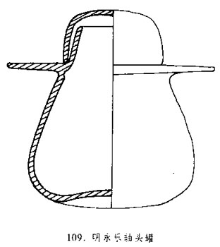 流行于明、清的一种罐式。明永乐时期创烧,因罐体似卷轴画的轴头而得名。造型为上小下大,斜直腹,圈底内凹,颈、腹之间有板沿,弧形帽式盖。清康熙、雍正朝多有仿制。(见图109)