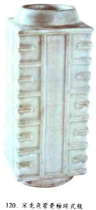 仿新石器时代玉琮造型的一种瓶。圆口,短颈,方柱形长身,圈足,口、是大小相若,有的器身四面凸起的横线装饰。最早的瓷质琮式瓶见于南宋官窑与龙泉窑器。明代石湾窑此类造型多施月白釉。入清之后,器身横线装饰演变为八卦纹,故后期又称为“八卦瓶”。(见图120)