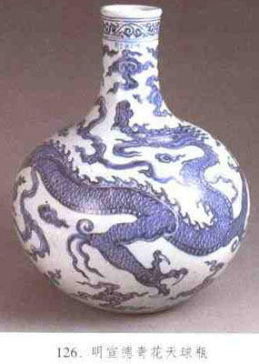 瓶式之一,是受西亚文化影响的器形。口微侈,直颈,球腹,平底。始见于明永乐朝,宣德器较永乐略显粗放,此后明代各朝未出现。清代康熙朝仿古之风盛行,天球瓶则多仿明初之器;雍正、乾隆时较为流行,多署本朝年款。(见图126)