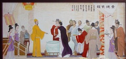 中国瓷都景德镇,是举世公认的东方古文化象征之一。正当瓷都筹备迎接2004年景德镇冠名千年之际,中年画家詹明荣为“千年庆典”所创作的瓷版人物画《景德瓷韵》问世。近2米长的大型瓷版上,映入眼帘的是一派金碧辉煌的金銮宝殿,黄袍金带的宋真宗赵恒与臣僚们正在欣赏称赞由江西浮梁县昌南镇上贡的极品———“影青釉”大龙缸和薄如蝉翼的薄胎长颈瓶……画家以生动传神的美术语汇与人物形象,表现了一个庄重与雄辉的历史真实和文化光点;鲜明而艺术地诠注了“景德镇”的产生由来。