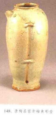 唐至五代时期流行的壶式之一。整体作并联的双鱼形,双鱼嘴为壶口,鱼体作壶身,鱼尾为假圈足。鱼背脊间各有凹槽,槽上下两端贴有桥形系,可系绳.故又名双鱼穿带壶。陶、瓷质双鱼壶是受金银器影响后出现的新品种。唐代越窑青瓷和三彩陶制品较多。1983年广东梅县出土唐代水车窑青釉双鱼壶,壶口外敞,鱼形腹,圈足仿鱼尾,肩部一侧装管形短流,双鱼之间有一凹槽、上下各设一系,足上部有穿孔,制作简练。1964年河北井陉县出土五代时期的白釉双鱼穿带壶,虽然双鱼的基本特征均有细致的刻画,但与唐代相比、缺少了简练、生动的效果。(见图148)