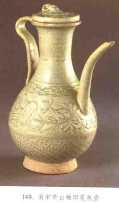 隋代出现的酒器之—,又称注子、注壶。据唐李匡《资暇集》“注子偏提”条云:“元和初,酌酒犹用樽杓。……居无何,稍用注子,其形若罂,而盖、嘴、柄皆具。”唐前期注子有盘口,短颈,鼓腹,圆筒形或六角形短直流,曲柄。唐晚期仅越窑烧造的注子样式就有5种之多。腹部多作瓜棱形,有短流、长流、曲柄、直柄等数种。五代至北宋,器身渐高,通体多压4至6条瓜棱,流渐趋细长微曲,曲柄高于壶口、平底变为图圈足。器形修长秀美,并多有注碗相配,注碗稍大于注腹,因内盛热水用以温酒,又称“温碗”。习惯上对于宋代的注子称为执壶、宋代壶式有10余种,腹部多作瓜棱形,器身趋于瘦长.流和柄上端高度相等,此外尚有兽流壶、提梁壶、葫芦式壶等。元代壶身多为玉壶春瓶式,弯流与壶颈之间以S形饰件相连。明、清之后,执壶造型增多,并多作茶具。(见图149)