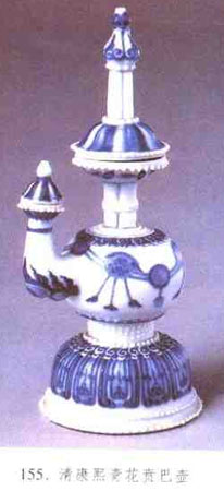 壶式之—,流行于清代,由藏族金属制品演变而来。器形为洗口、束颈、球形腹,高足外撇,腹部有龙首形流弯曲向上,无柄是一种祭祀用品。(见图155)