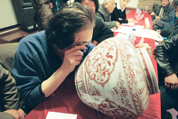 官窑瓷盘的出现让现场掀起了一个小小高潮。上午11时30分,在多名保安人员的护卫下,一件大连收藏者的巨大古瓷瓶出现在会场主席台上。这件瓷瓶出现后,6位主持鉴宝的专家立即围拢上来,这件瓷瓶成了会场的焦点。